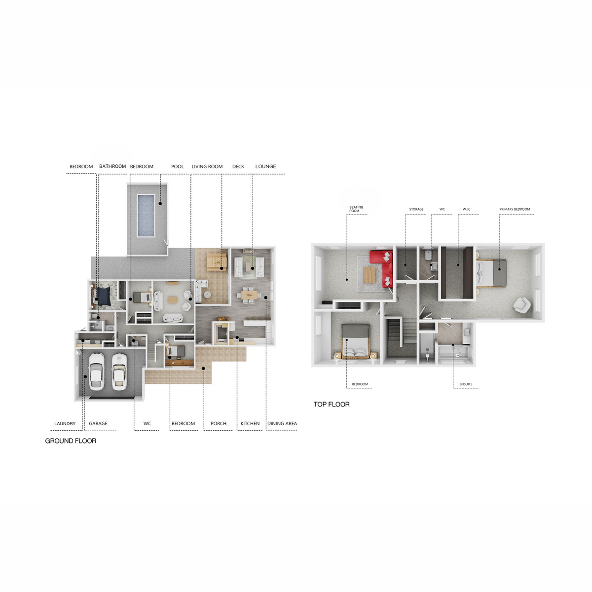 The upper level is a private retreat. The primary suite features custom walk-in robe and generous ensuite with bath. An additional bedroom with double wardrobe, a separate powder room, and a sitting room complete this level, offering space for work, reading, or enjoying the views.